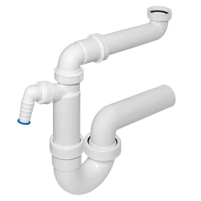 DALLMER Raumspar-Siphon 121, nach DIN EN 411, Anschlüsse: 1 1/2″ x DN 50 Mit verstellbarem Kugelgelenk- Ablaufbogen, einem Waschgeräteanschluss, Raumsparverbinder zur platzsparenden Montage. Material: Polypropylen, weiß, schlagfest