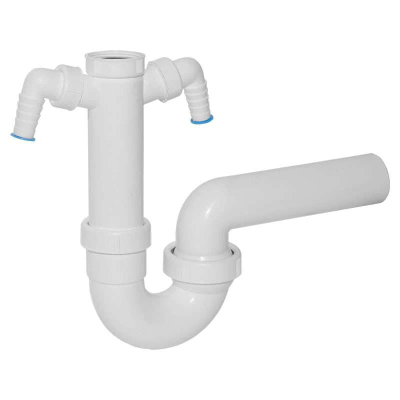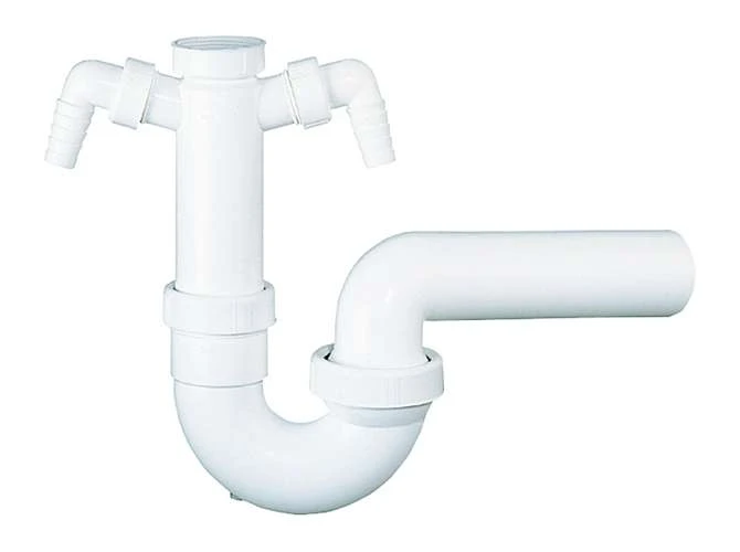 DALLMER Röhren-Siphon 100/2, nach DIN EN 411 Anschlüsse: 1 1/2″ x DN 50, Material: Polypropylen, hochschlagfest mit verstellbarem Kugelgelenk- Ablaufbogen und zwei Waschgeräte- Anschlüssen.