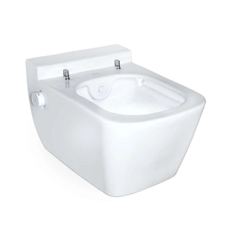 Spülrandlose WC-Keramik mit integrierter Duschfunktion zur komfortablen Gesäßreinigung mit Wasser. Duschfunktion erfolgt stromlos über bauseitigen Warm- und Kaltwasseranschluss. WC-Keramik für Wandeinbauspülkästen.